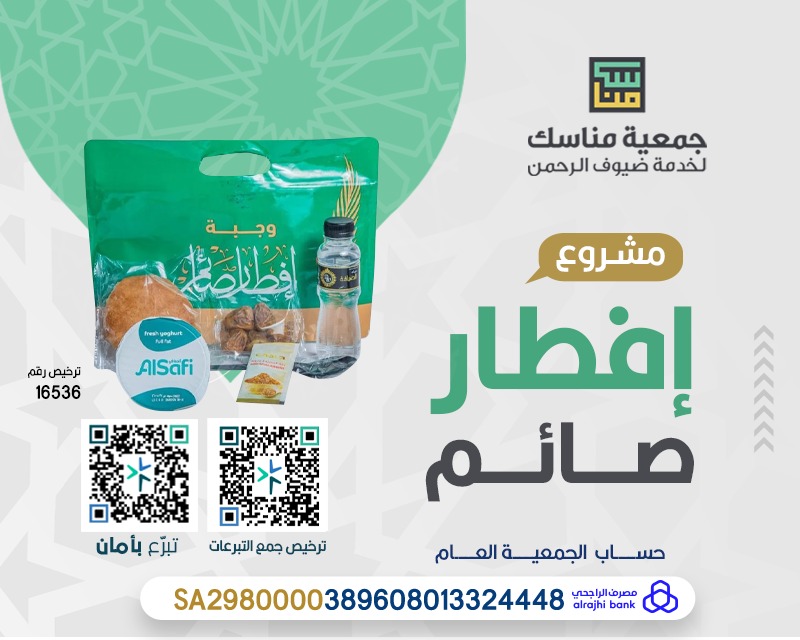 ساهم في توفير وجبات الإفطار في شهر رمضان المبارك لضيوف الرحمن معتمري بيت الله الحرام وزوّاره، بتبرعك تُعين على توفيرها لهم ويكون لك سهم في الخير، قال رسول الله -صلى الله عليه وسلم-:"مَنْ فَطَّرَ صَائمًا، كانَ لَهُ مِثْلُ أَجْرِهِ غَيْرَ أَنَّهُ لاَ يَنْقُصُ مِنْ أجْر الصَّائمِ شيئاً"